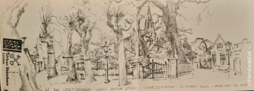 Zaterdag 16 maart 2024, samen met de Urbans Sketchers Leiden waren we te gast in Voorschoten. Waarom in Voorschoten terwijl er nog zoveel moois in Leiden is te ontdekken, dat is me ontgaan. In ieder geval, zaterdagmiddag, bepakt met vulpen welke ik nog snel voor vertrek heb gevuld met watervaste inkt, een aquarelset, het favoriete doosje met oliepastels, kleurpotloden en voor de zekerheid een vulpotlood. Natuurlijk was mijn trouwe toeverlaat er ook, een felrode thermokoffiemok.