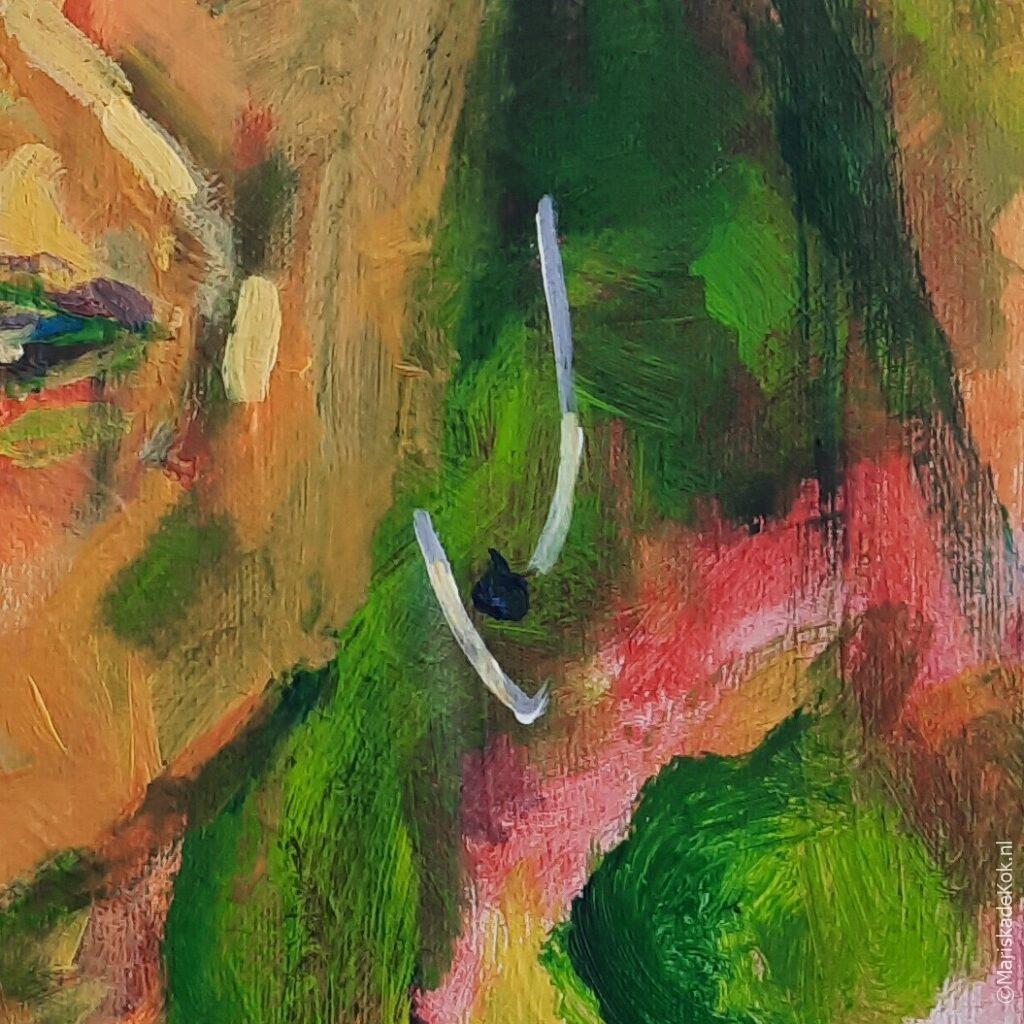 In het tweede deel begint er wel iets meer rust in de kamer te komen. De dames worden wat moe. Moe van het geconcentreerd schilderen, de verhalen en ons prachtige model van vandaag was ook moe van het stilzitten. Hoewel ….. stilzitten?! Oordeel zelf.