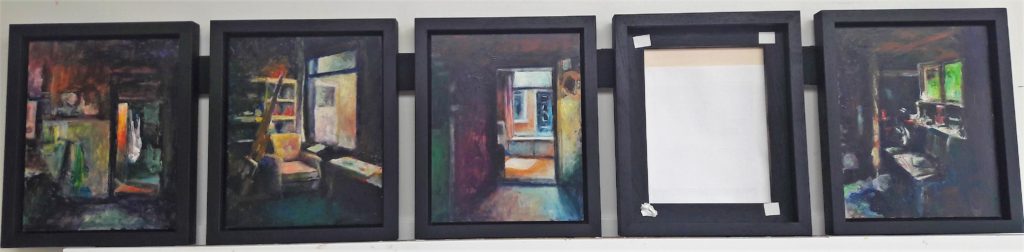 De vraag is wie en vooral waarom iemand dit werk heeft meegenomen. Het is vrij “bruut” uit zijn lijst gehaald. Dit werk was zoals gezegd onderdeel van een serie, die ik juist speciaal op twee latten had vastgeschroefd. Één omdat dit makkelijker waterpas is op te hangen en twee ter voorkoming dat iemand dit gemakkelijk mee zou kunnen nemen. Niet bedenkend dat iemand zich vrij voelde om het werk uit de lijst te wrikken. Ik mag hopen dat hij / zij in ieder geval het schilderij zo kan waarderen, dat het de moeite die is genomen, waard is.